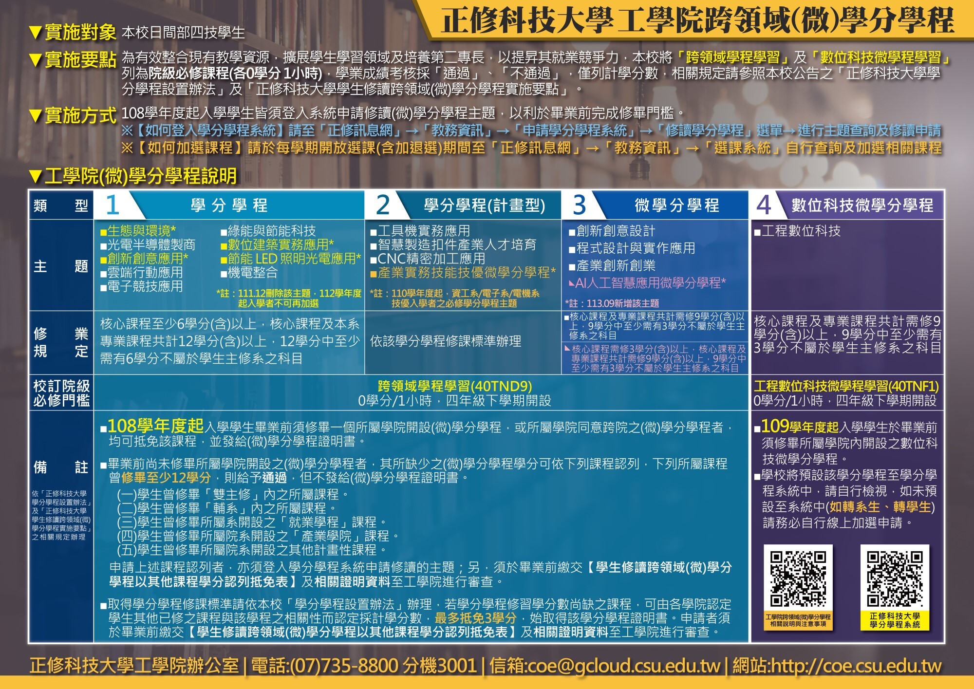 1.依本校規定,108學年度起入學之日間部四技學生「須於畢業前至少修畢一個(微)學分學程」;109學年度起入學之日間部四技學生「須於畢業前至少修畢一個(微)學分學程;及所屬學院內開設數位科技微學分學程」,詳細規定請參照《正修科技大學跨領域學分學程手冊》。