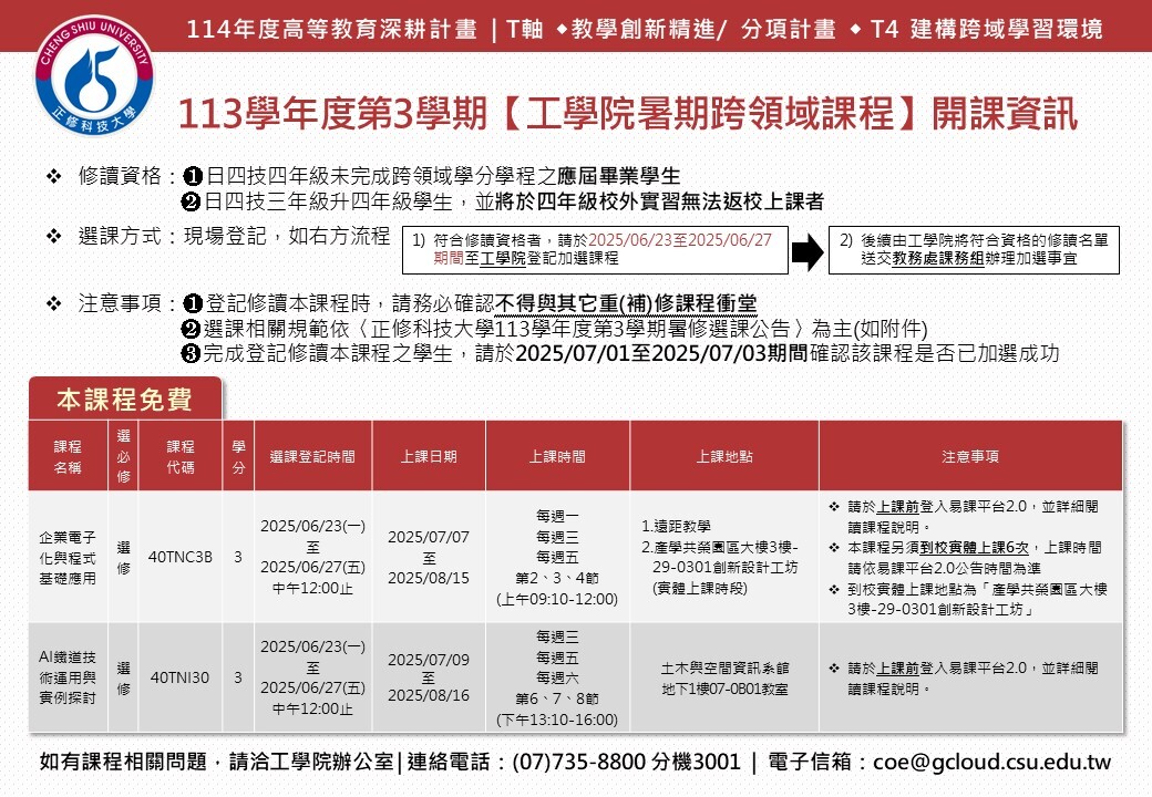 [選課資訊]113學年度第三學期【工學院暑期跨領域課程】開課資訊